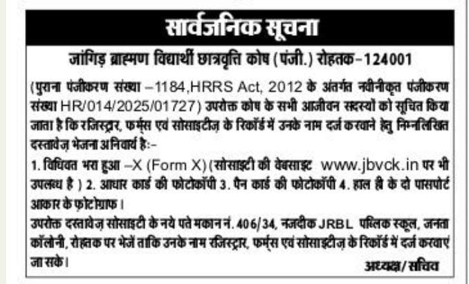 The society was registered vide registration no 1184 dated 11.03.1991 to help financialy deprived but deserving and meritorious student of Angira / Jangir community and to help them by providing scholarship as far as possible. After implementation of HRRS Act, 2012 the society was re-registered under the Act vide registration no HR/014/2025/01727 dated 07.07.2025